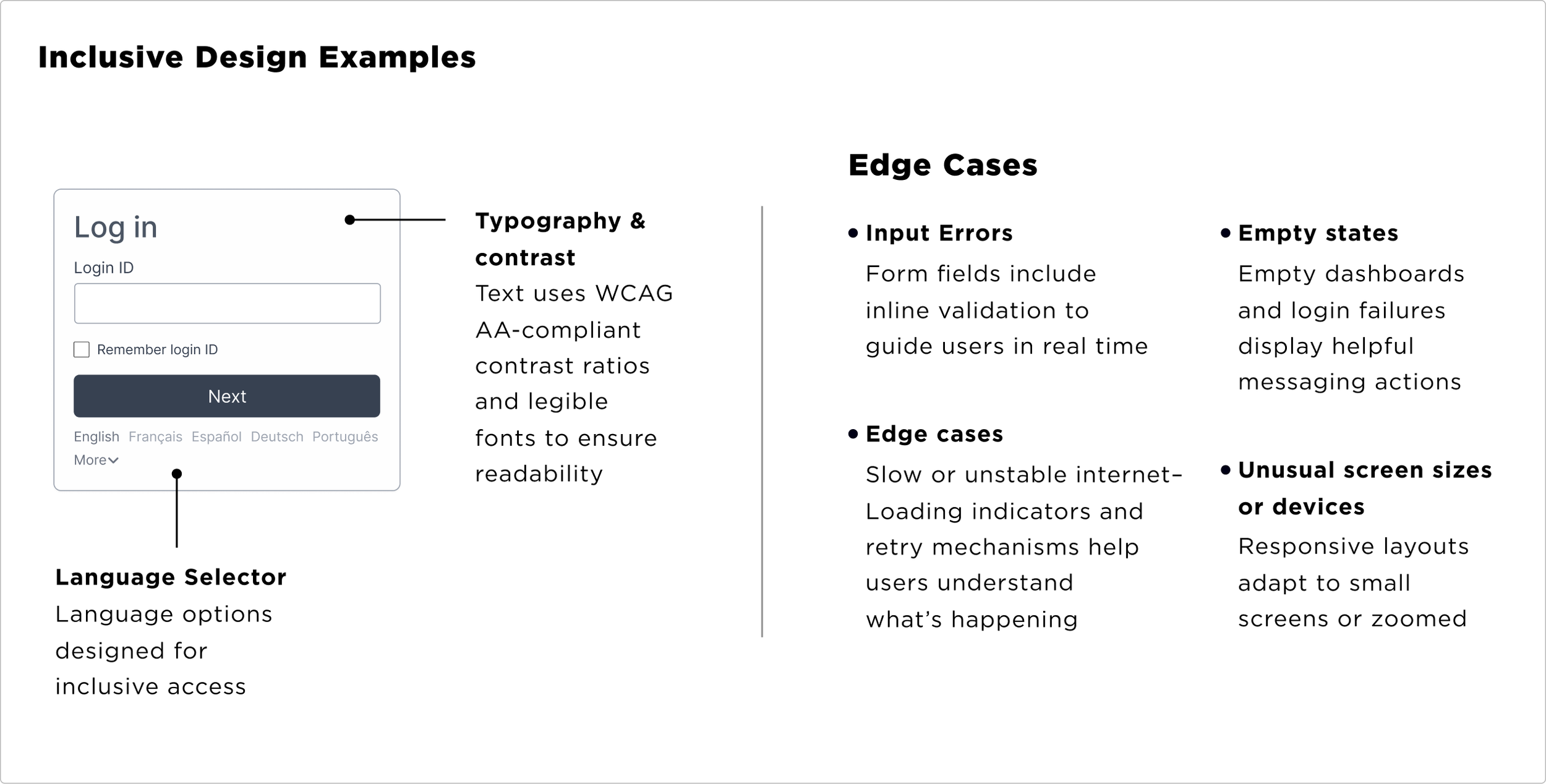 Designing with inclusivity in mind, I planned for accessibility standards and accounted for real-world edge cases to ensure resilience across devices and contexts.