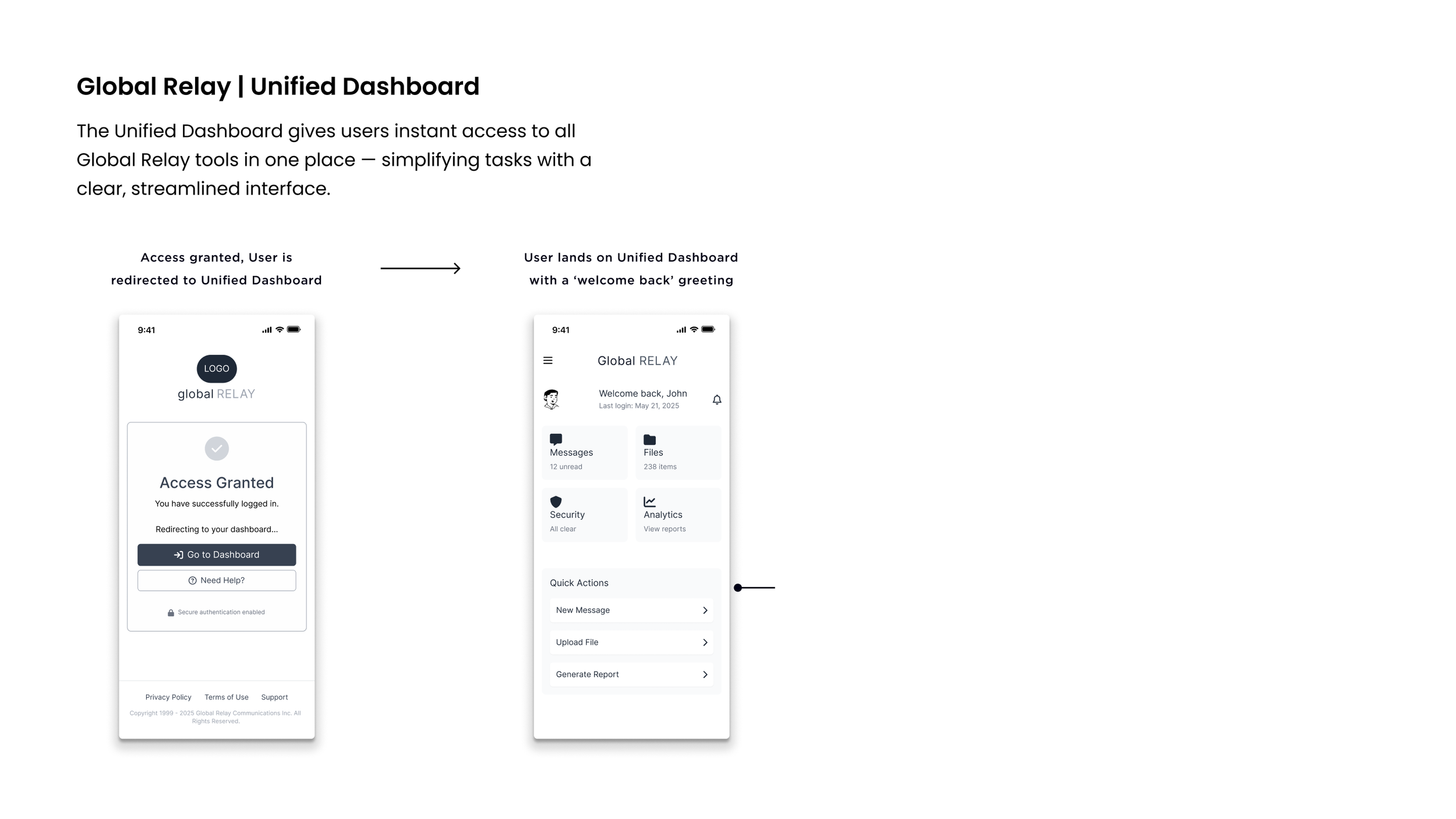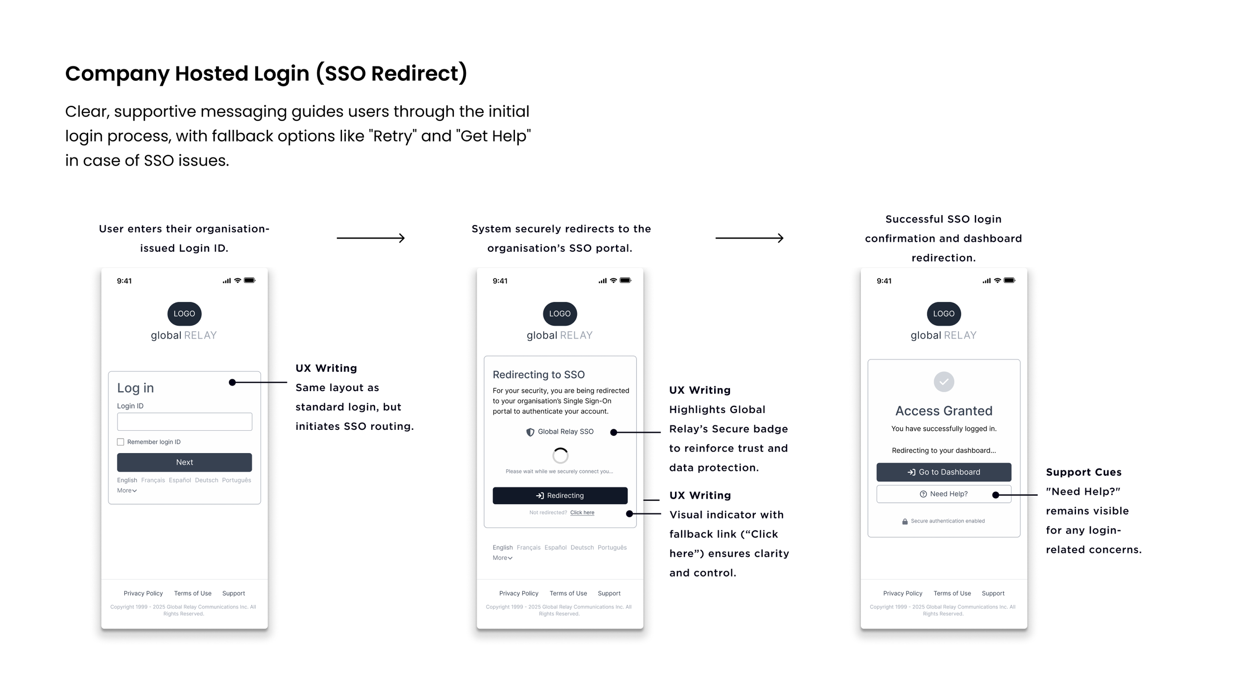 Global Relay needed a unified login experience across its suite of financial compliance tools. But with multiple authentication methods (ID/password and SSO), users were unsure how to log in, often encountering friction, errors, or unclear redirects—especially on mobile.