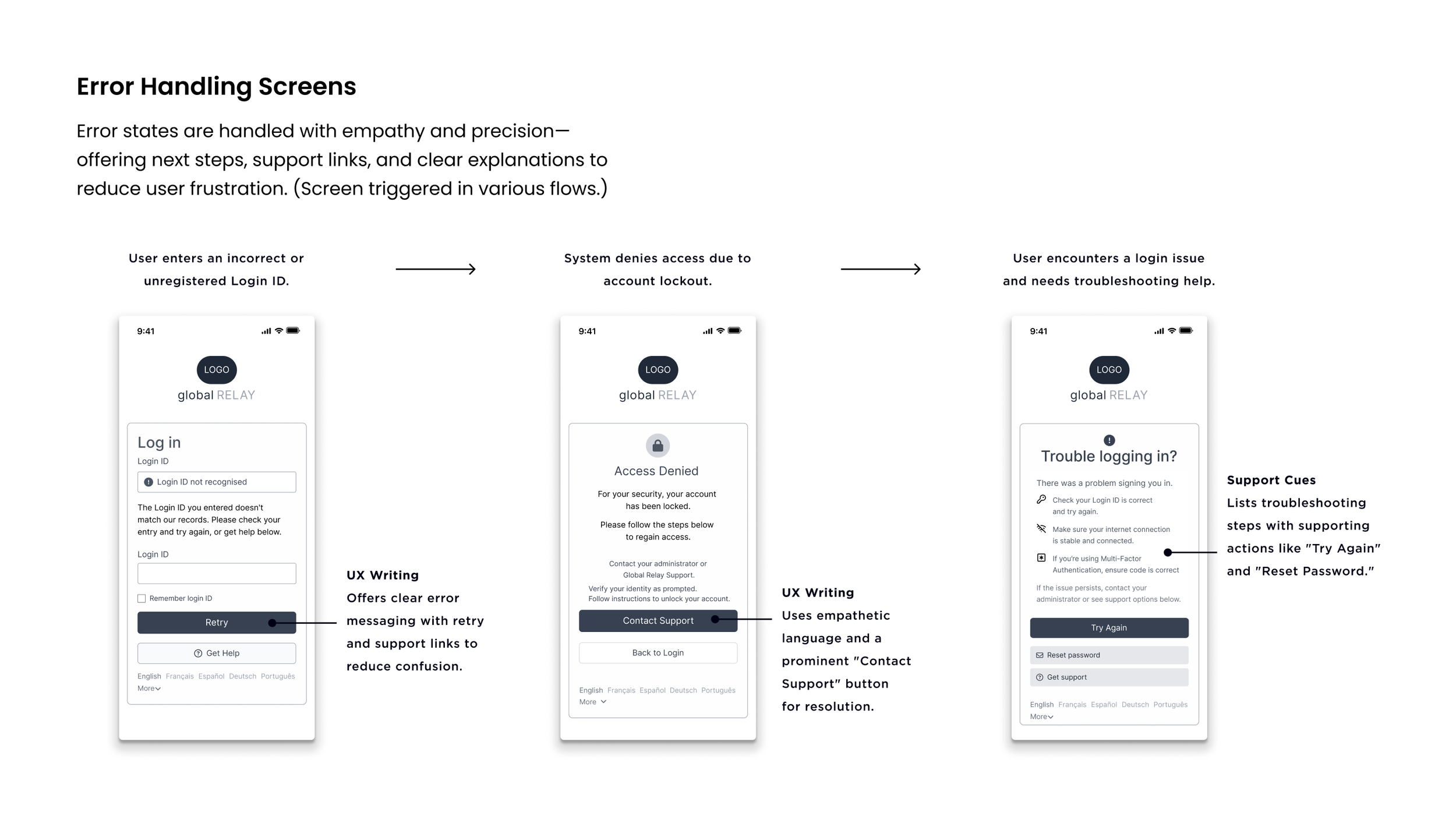 Clear, human-friendly language was designed to guide users, reduce confusion, and provide reassurance across login, error, and progress states.